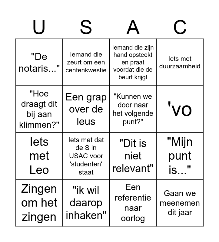 This bingo card has 16 words: "ik wil daarop inhaken", "Mijn punt is...", Iemand die zijn hand opsteekt en praat voordat die de beurt krijgt, "De notaris...", Iets met Leo, Iemand die zeurt om een centenkwestie, "Dit is niet relevant", Een referentie naar oorlog, "Hoe draagt dit bij aan klimmen?", Een grap over de leus, Zingen om het zingen, Iets met duurzaamheid, Iets met dat de S in USAC voor 'studenten' staat, 'vo, "Kunnen we door naar het volgende punt?" and Gaan we meenemen dit jaar.
