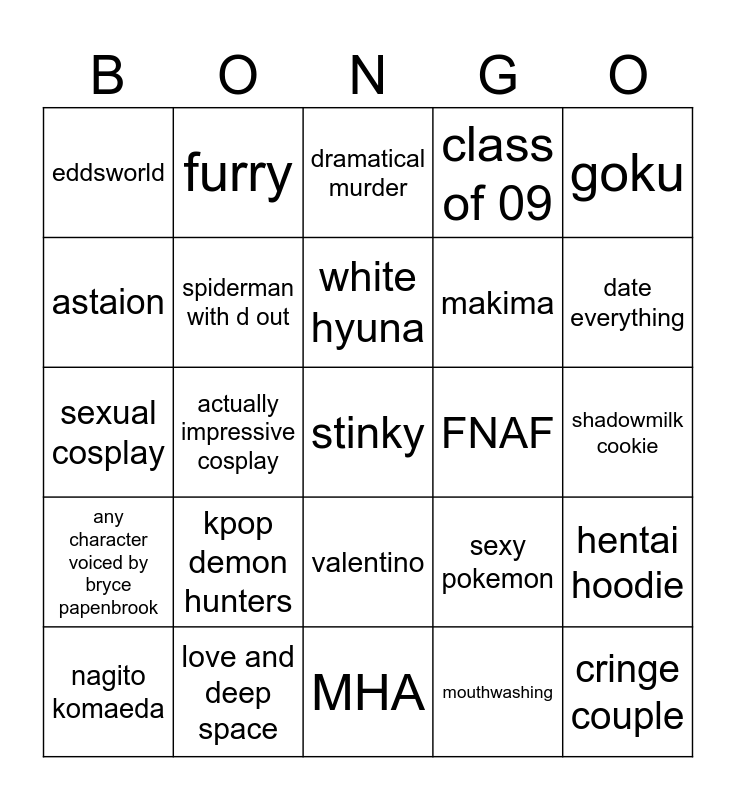 This bingo card has a free space and 24 words: kpop demon hunters, love and deep space, white hyuna, nagito komaeda, goku, eddsworld, astaion, furry, FNAF, valentino, makima, sexual cosplay, sexy pokemon, hentai hoodie, spiderman with d out, mouthwashing, shadowmilk cookie, dramatical murder, date everything, actually impressive cosplay, cringe couple, any character voiced by bryce papenbrook, class of 09 and MHA.