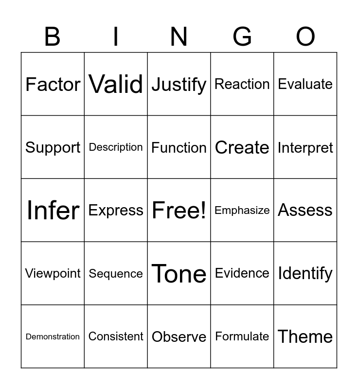 This bingo card has a free space and 100 words: Analyze, Argument, Assess, Assume, Benefit, Category, Cite, Claim, Clarify, Compare, Contrast, Conclude, Consequence, Consistent, Construct, Contribute, Create, Critique, Data, Define, Demonstrate, Describe, Determine, Develop, Distinguish, Emphasize, Evaluate, Evidence, Examine, Explain, Express, Factor, Feature, Focus, Formulate, Function, Identify, Illustrate, Impact, Implement, Imply, Indicate, Infer, Influence, Interpret, Justify, Maintain, Method, Modify, Observe, Opinion, Organize, Outcome, Paragraph, Participate, Persuade, Predict, Process, Purpose, Reaction, Refer, Reflect, Relationship, Relevant, Represent, Require, Respond, Result, Reveal, Role, Select, Sequence, Similar, Source, Structure, Suggest, Summarize, Support, Symbol, Synthesize, Text, Theme, Theory, Tone, Transition, Valid, Value, Variable, Verify, Viewpoint, Vocabulary, Conclude, Convince, Demonstration, Description, Distinction, Evidence, Explanation, Interpretation and Organization.