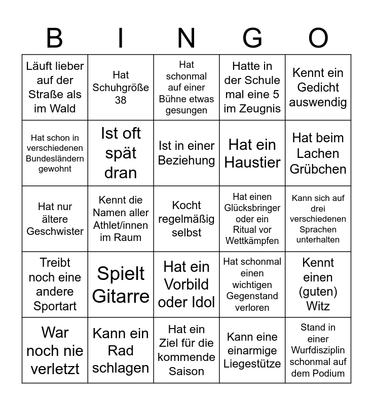 This bingo card has 25 words: Spielt Gitarre, Hat ein Ziel für die kommende Saison, Ist in einer Beziehung, War noch nie verletzt, Kennt ein Gedicht auswendig, Läuft lieber auf der Straße als im Wald, Hat schon in verschiedenen Bundesländern gewohnt, Hat Schuhgröße 38, Hat einen Glücksbringer oder ein Ritual vor Wettkämpfen, Hat ein Vorbild oder Idol, Hat ein Haustier, Hat nur ältere Geschwister, Hat schonmal einen wichtigen Gegenstand verloren, Kennt einen (guten) Witz, Ist oft spät dran, Stand in einer Wurfdisziplin schonmal auf dem Podium, Kann sich auf drei verschiedenen Sprachen unterhalten, Hat schonmal auf einer Bühne etwas gesungen, Hat beim Lachen Grübchen, Kennt die Namen aller Athlet/innen im Raum, Kocht regelmäßig selbst, Kann ein Rad schlagen, Treibt noch eine andere Sportart, Hatte in der Schule mal eine 5 im Zeugnis and Kann eine einarmige Liegestütze.