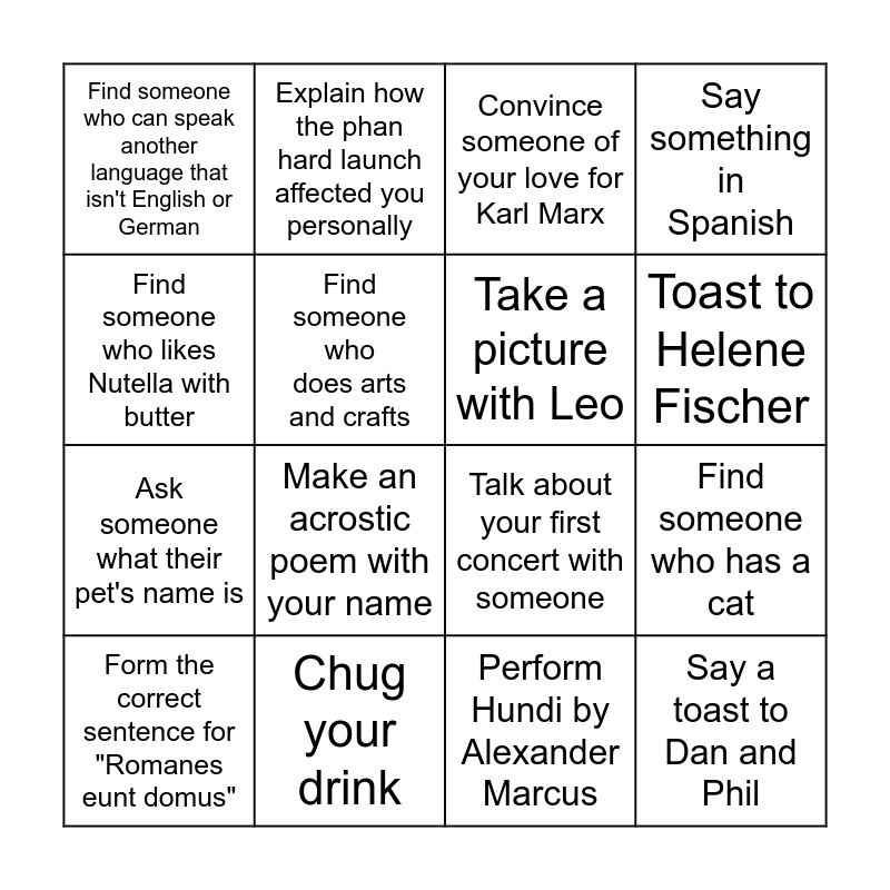 This bingo card has 17 words: Perform Hundi by Alexander Marcus, Form the correct sentence for "Romanes eunt domus", Convince someone of your love for Karl Marx, Find someone who can speak another language that isn't English or German, Make an acrostic poem with your name, Say something in Spanish, Find someone who has a cat, Take a picture with Leo, Toast to Helene Fischer, Find someone who does arts and crafts, Chug your drink, Talk about your first concert with someone, Find someone who likes Nutella with butter, Explain how the phan hard launch affected you personally, Ask someone what their pet's name is, Spin someone around and Say a toast to Dan and Phil.