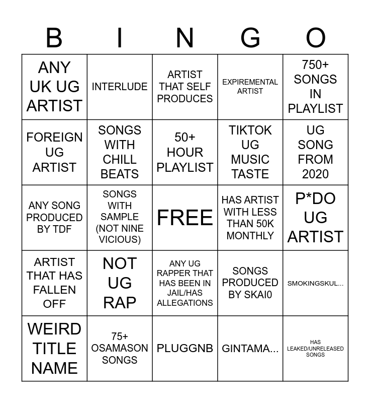 This bingo card has a free space and 24 words: NOT UG RAP, 75+ OSAMASON SONGS, 50+ HOUR PLAYLIST, WEIRD TITLE NAME, 750+ SONGS IN PLAYLIST, ANY UK UG ARTIST, FOREIGN UG ARTIST, INTERLUDE, HAS ARTIST WITH LESS THAN 50K MONTHLY, ANY UG RAPPER THAT HAS BEEN IN JAIL/HAS ALLEGATIONS, TIKTOK UG MUSIC TASTE, ANY SONG PRODUCED BY TDF, SONGS PRODUCED BY SKAI0, SMOKINGSKUL..., SONGS WITH CHILL BEATS, GINTAMA..., P*DO UG ARTIST, ARTIST THAT SELF PRODUCES, UG SONG FROM 2020, SONGS WITH SAMPLE (NOT NINE VICIOUS), HAS LEAKED/UNRELEASED SONGS, ARTIST THAT HAS FALLEN OFF, EXPIREMENTAL ARTIST and PLUGGNB.