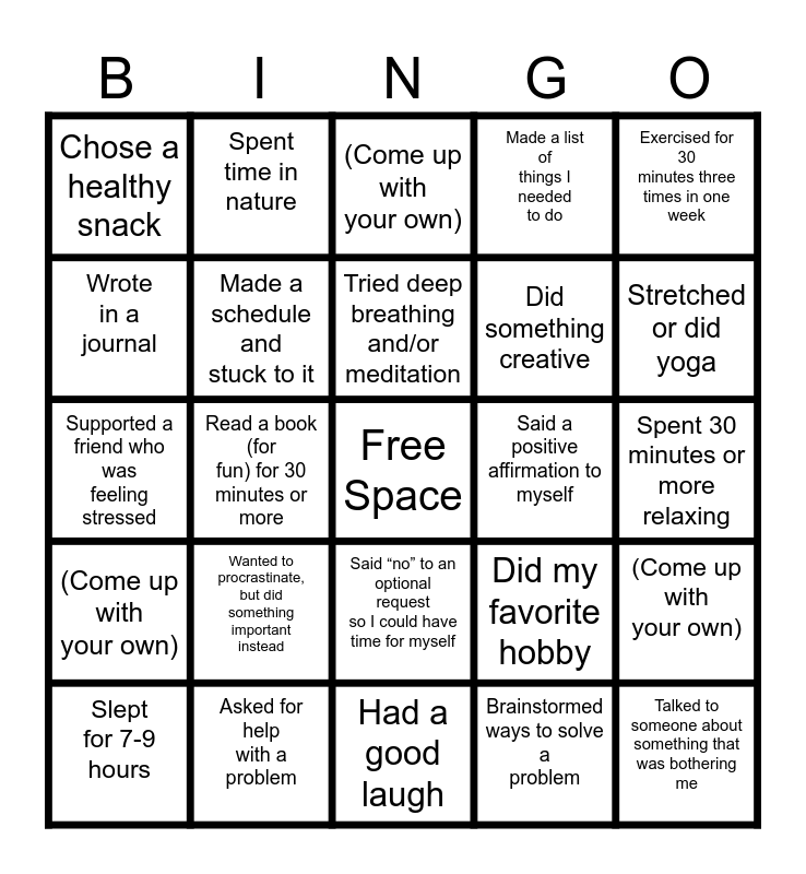 This bingo card has a free space and 24 words: Wanted to procrastinate, but did something important instead, Asked for help with a problem, Tried deep breathing and/or meditation, Slept for 7-9 hours, Exercised for 30 minutes three times in one week, Chose a healthy snack, Wrote in a journal, Spent time in nature, Said a positive affirmation to myself, Said “no” to an optional request so I could have time for myself, Did something creative, Supported a friend who was feeling stressed, Did my favorite hobby, (Come up with your own), Made a schedule and stuck to it, Brainstormed ways to solve a problem, Spent 30 minutes or more relaxing, (Come up with your own), Stretched or did yoga, Read a book (for fun) for 30 minutes or more, Talked to someone about something that was bothering me, (Come up with your own), Made a list of things I needed to do and Had a good laugh.