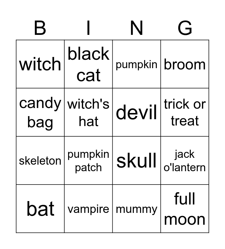 This bingo card has 25 words: costume, mask, trick or treat, candy, candy bag, witch, witch's hat, black cat, vampire, frankenstein, skeleton, skull, Free!, werewolf, devil, ghost, mummy, pumpkin, pumpkin patch, jack o'lantern, bat, spider, full moon, broom and haunted house.