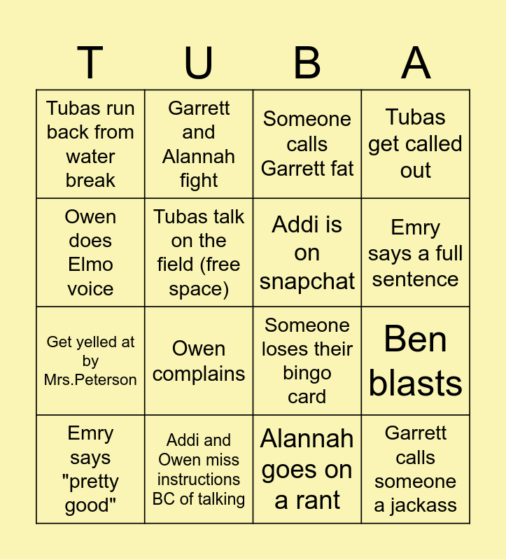 This bingo card has 17 words: Alannah goes on a rant, Emry says "pretty good", Someone calls Garrett fat, Tubas run back from water break, Owen complains, Tubas get called out, Ben blasts, Addi is on snapchat, Emry says a full sentence, Tubas talk on the field (free space), Addi and Owen miss instructions BC of talking, Someone loses their bingo card, Owen does Elmo voice, Garrett and Alannah fight, Get yelled at by Mrs.Peterson, Ashley has perfect form and Garrett calls someone a jackass.