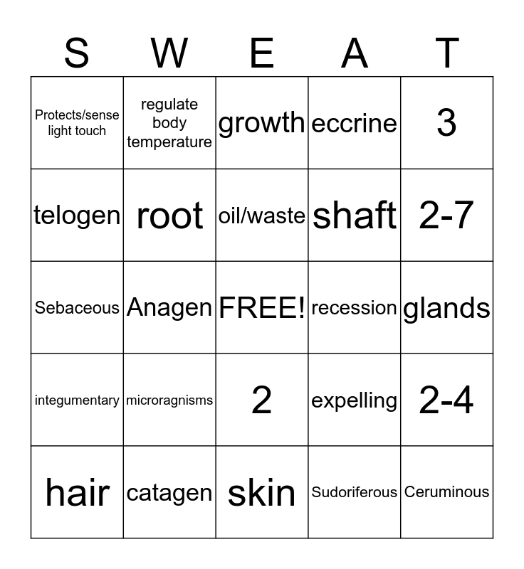 This bingo card has a free space and 24 words: microragnisms, catagen, oil/waste, hair, 3, Protects/sense light touch, telogen, regulate body temperature, recession, 2, shaft, Sebaceous, expelling, 2-4, root, Sudoriferous, glands, growth, 2-7, Anagen, Ceruminous, integumentary, eccrine and skin.