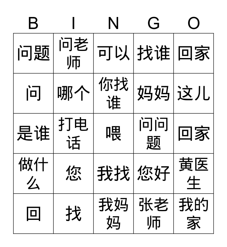 This bingo card has a free space and 24 words: 您, 找, 你找谁, 回, 回家, 问题, 问, 问老师, 问问题, 我找, 妈妈, 是谁, 您好, 黄医生, 哪个, 张老师, 回家, 可以, 这儿, 打电话, 我的家, 做什么, 找谁 and 我妈妈.