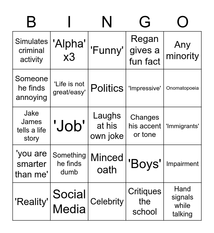 This bingo card has a free space and 24 words: Something he finds dumb, Social Media, Politics, 'Reality', Any minority, Simulates criminal activity, Someone he finds annoying, 'Alpha' x3, Changes his accent or tone, Minced oath, 'Impressive', Jake James tells a life story, 'Boys', Impairment, 'Life is not great/easy', Critiques the school, 'Immigrants', 'Funny', Onomatopoeia, 'Job', Hand signals while talking, 'you are smarter than me', Regan gives a fun fact and Celebrity.