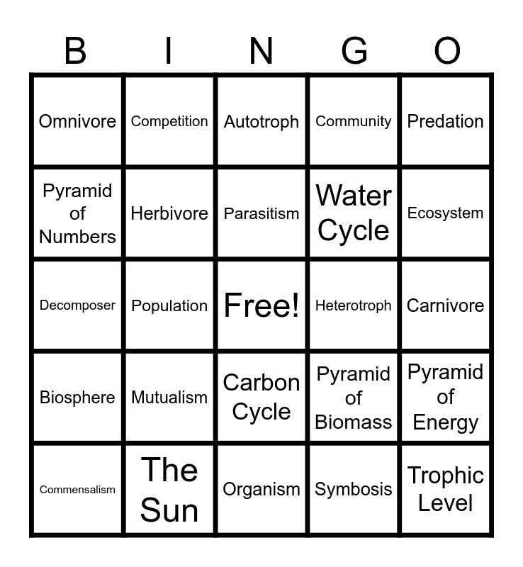 This bingo card has a free space and 24 words: Commensalism, Mutualism, Parasitism, Symbosis, Predation, Omnivore, Competition, Autotroph, Heterotroph, Carnivore, Decomposer, Herbivore, Pyramid of Biomass, Pyramid of Energy, Pyramid of Numbers, The Sun, Organism, Community, Ecosystem, Biosphere, Population, Carbon Cycle, Water Cycle and Trophic Level.