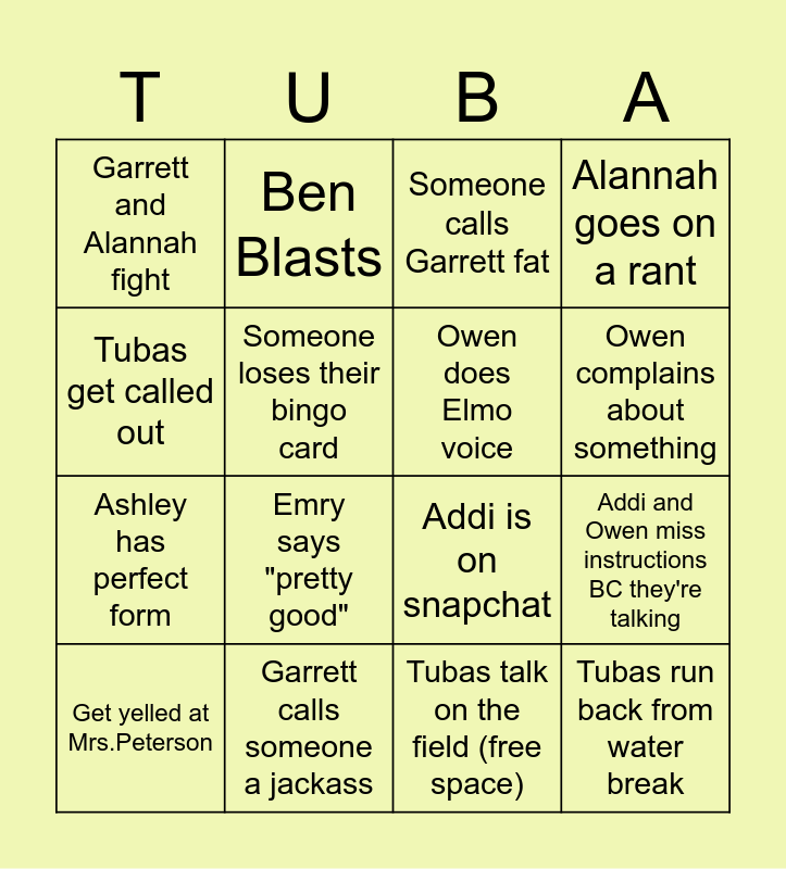 This bingo card has 18 words: Emry says "pretty good", Tubas run back from water break, Someone calls Garrett fat, Garrett and Alannah fight, Addi is on snapchat, Alannah goes on a rant, Get yelled at Mrs.Peterson, Ben Blasts, Owen complains about something, Ashley has perfect form, Tubas talk on the field (free space), Tubas get called out, Addi and Owen miss instructions BC they're talking, Someone loses their bingo card, Owen does Elmo voice, Emry says a full sentence, Garrett calls someone a jackass and Ashley talks about music.