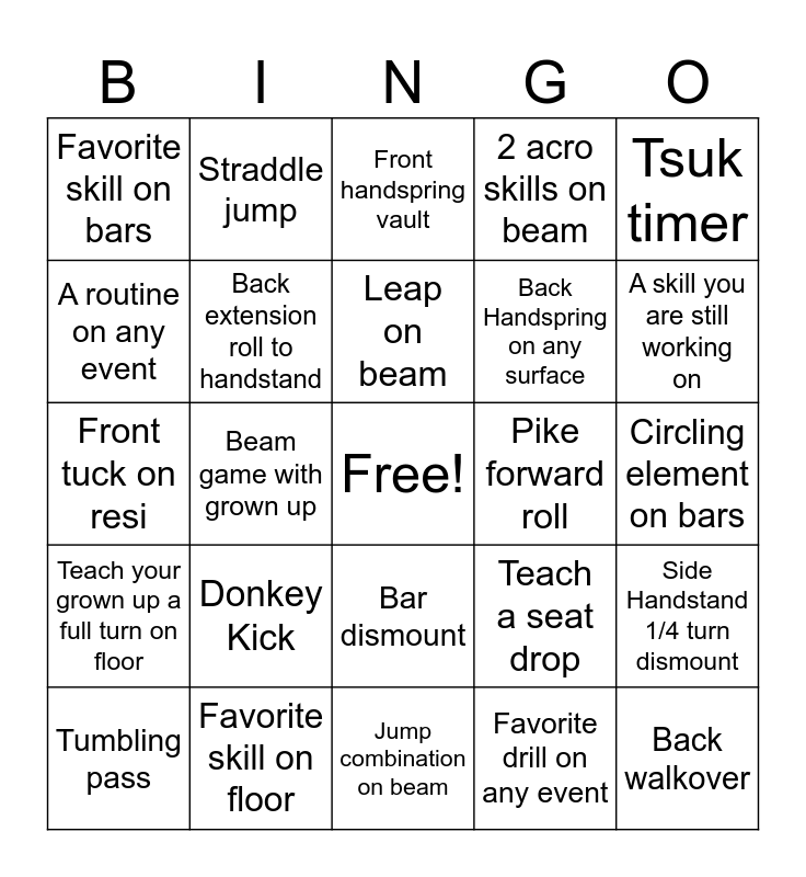 This bingo card has a free space and 24 words: Donkey Kick, Favorite skill on floor, Leap on beam, Tumbling pass, Tsuk timer, Favorite skill on bars, A routine on any event, Straddle jump, Pike forward roll, Bar dismount, Back Handspring on any surface, Front tuck on resi, Teach a seat drop, Side Handstand 1/4 turn dismount, Back extension roll to handstand, Favorite drill on any event, Circling element on bars, Front handspring vault, A skill you are still working on, Beam game with grown up, Back walkover, Teach your grown up a full turn on floor, 2 acro skills on beam and Jump combination on beam.