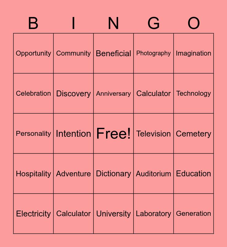This bingo card has a free space and 24 words: Adventure, Calculator, Anniversary, Electricity, Imagination, Opportunity, Celebration, Community, Television, Dictionary, Calculator, Personality, Auditorium, Education, Discovery, Laboratory, Cemetery, Beneficial, Technology, Intention, Generation, Hospitality, Photography and University.