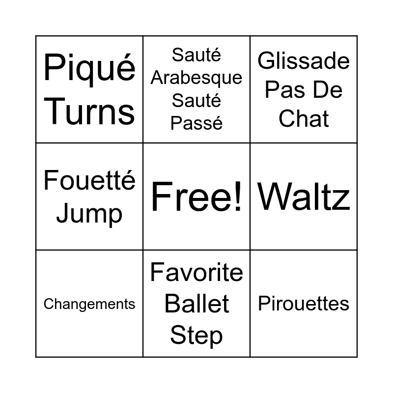This bingo card has a free space and 8 words: Waltz, Glissade Pas De Chat, Sauté Arabesque Sauté Passé, Changements, Piqué Turns, Pirouettes, Fouetté Jump and Favorite Ballet Step.