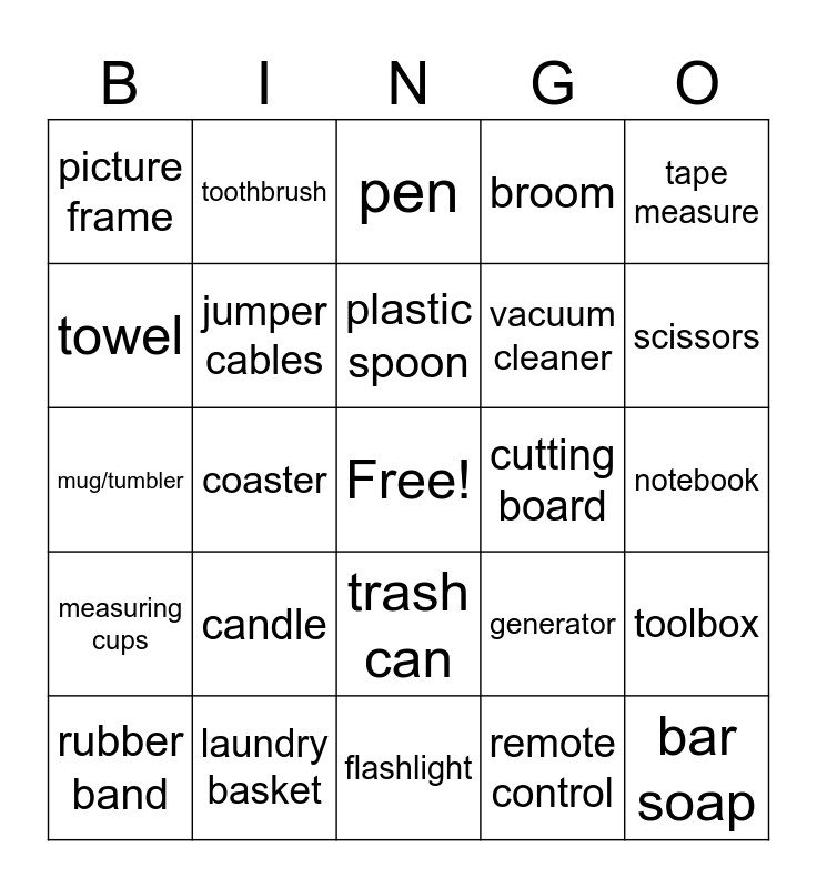 This bingo card has a free space and 24 words: candle, laundry basket, plastic spoon, rubber band, tape measure, picture frame, towel, toothbrush, cutting board, trash can, vacuum cleaner, mug/tumbler, generator, toolbox, jumper cables, remote control, notebook, pen, scissors, coaster, bar soap, measuring cups, broom and flashlight.