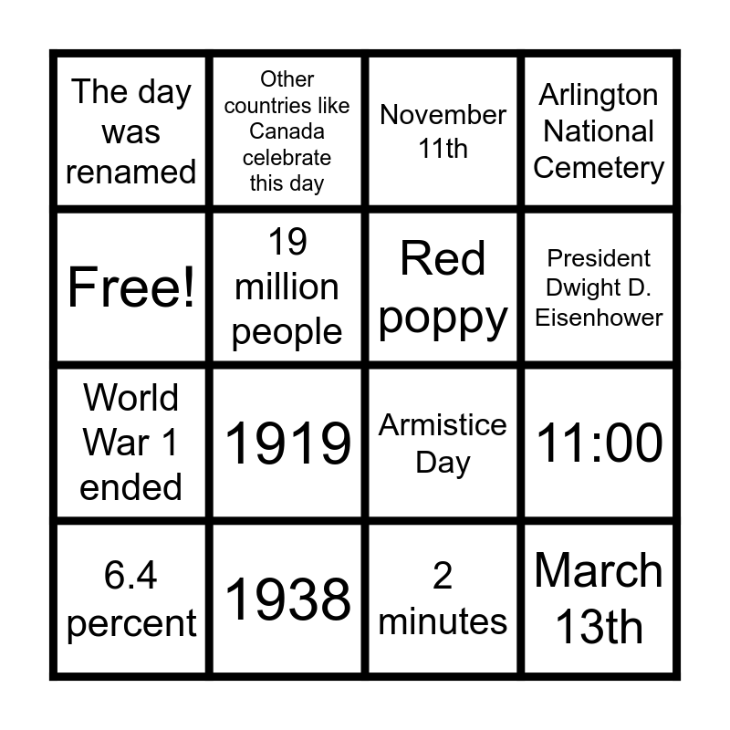 This bingo card has 16 words: 1938, 11:00, November 11th, The day was renamed, World War 1 ended, Other countries like Canada celebrate this day, Armistice Day, 2 minutes, Free!, 19 million people, 6.4 percent, Arlington National Cemetery, 1919, President Dwight D. Eisenhower, Red poppy and March 13th.