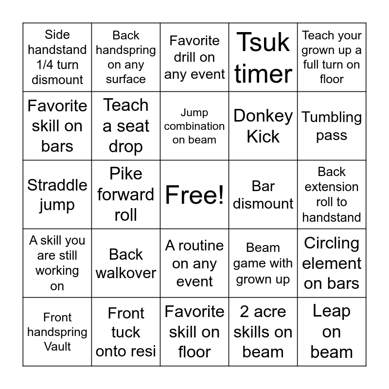 This bingo card has a free space and 24 words: Back walkover, Front tuck onto resi, Jump combination on beam, Front handspring Vault, Teach your grown up a full turn on floor, Side handstand 1/4 turn dismount, Favorite skill on bars, Back handspring on any surface, Bar dismount, A routine on any event, Donkey Kick, Straddle jump, Beam game with grown up, Circling element on bars, Teach a seat drop, 2 acre skills on beam, Back extension roll to handstand, Favorite drill on any event, Tumbling pass, Pike forward roll, Leap on beam, A skill you are still working on, Tsuk timer and Favorite skill on floor.