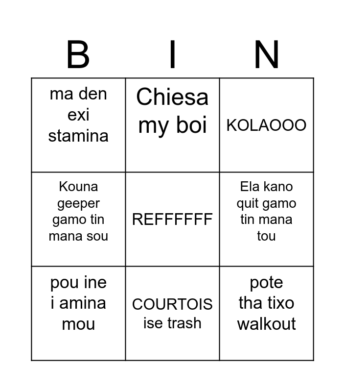 This bingo card has a free space and 8 words: Ela kano quit gamo tin mana tou, KOLAOOO, Chiesa my boi, pou ine i amina mou, ma den exi stamina, pote tha tixo walkout, Kouna geeper gamo tin mana sou and COURTOIS ise trash.