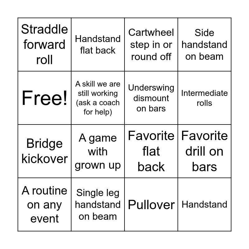 This bingo card has 16 words: Single leg handstand on beam, Favorite drill on bars, Cartwheel step in or round off, Straddle forward roll, Bridge kickover, Handstand flat back, Favorite flat back, Pullover, Free!, A skill we are still working (ask a coach for help), A routine on any event, Side handstand on beam, A game with grown up, Intermediate rolls, Underswing dismount on bars and Handstand.