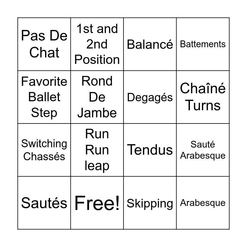 This bingo card has 16 words: Free!, Sauté Arabesque, Balancé, Pas De Chat, Switching Chassés, 1st and 2nd Position, Tendus, Skipping, Favorite Ballet Step, Rond De Jambe, Sautés, Battements, Run Run leap, Chaîné Turns, Degagés and Arabesque.