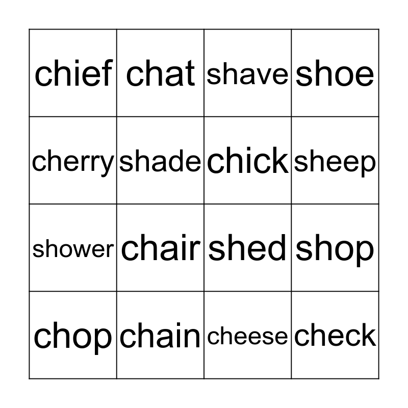 This bingo card has 16 words: chain, shop, shave, chief, shower, chat, shed, cheese, cherry, shade, chop, shoe, chair, sheep, chick and check.