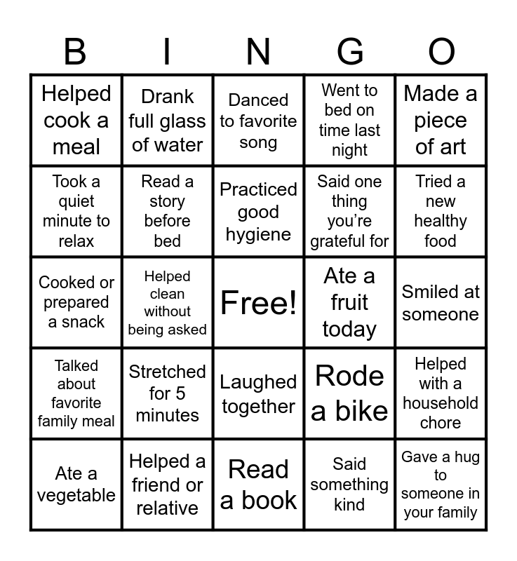 This bingo card has a free space and 28 words: Helped with a household chore, Took a short walk or played outside, Said one thing you’re grateful for, Said something kind, Took a quiet minute to relax, Danced to favorite song, Drank full glass of water, Talked about favorite family meal, Ate a fruit today, Ate a vegetable, Cooked or prepared a snack, Went to bed on time last night, Helped a friend or relative, Read a book, Tried a new healthy food, Talked about your feelings, Stretched for 5 minutes, Read a story before bed, Practiced good hygiene, Laughed together, Helped cook a meal, Read a nutrition label, Gave a hug to someone in your family, Helped clean without being asked, Smiled at someone, Rode a bike, Made a piece of art and Took a short break from screens.
