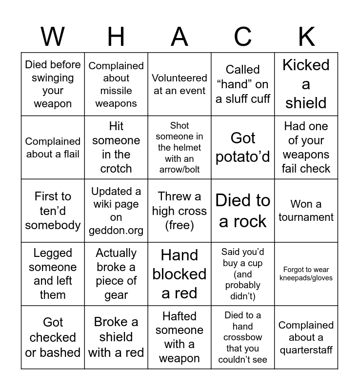 This bingo card has a free space and 24 words: Actually broke a piece of gear, Broke a shield with a red, Shot someone in the helmet with an arrow/bolt, Got checked or bashed, Kicked a shield, Died before swinging your weapon, Complained about a flail, Complained about missile weapons, Died to a rock, Hand blocked a red, Got potato’d, First to ten’d somebody, Said you’d buy a cup (and probably didn’t), Forgot to wear kneepads/gloves, Hit someone in the crotch, Died to a hand crossbow that you couldn’t see, Won a tournament, Volunteered at an event, Had one of your weapons fail check, Updated a wiki page on geddon.org, Complained about a quarterstaff, Legged someone and left them, Called “hand” on a sluff cuff and Hafted someone with a weapon.