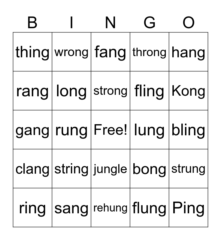 This bingo card has a free space and 24 words: string, sang, strong, ring, hang, thing, rang, wrong, lung, jungle, fling, gang, bong, strung, long, flung, bling, fang, Kong, rung, Ping, clang, throng and rehung.