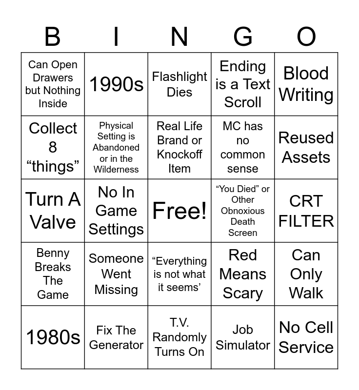This bingo card has a free space and 34 words: Tool breaks after one use, Job Simulator, Outdated Media Use, PS1 Style Graphics, Benny Breaks The Game, Physical Setting is Abandoned or in the Wilderness, Blood Writing, 1980s, 1990s, Cheap Jumpscares, Real Life Brand or Knockoff Item, Flashlight Dies, No Reflection In Mirrors, Multiple Endings, “You Died” or Other Obnoxious Death Screen, Reused Assets, Fix The Generator, Turn A Valve, Someone Went Missing, Red Means Scary, “Everything is not what it seems’, Phone Rings But No One is on The Other End, Can Open Drawers but Nothing Inside, CRT FILTER, T.V. Randomly Turns On, No Cell Service, Ending is a Text Scroll, Game is more tedious than scary, MC has no common sense, Collect 8 “things”, Forced to go in the basement, No In Game Settings, Can Only Walk and Chase Sequence.