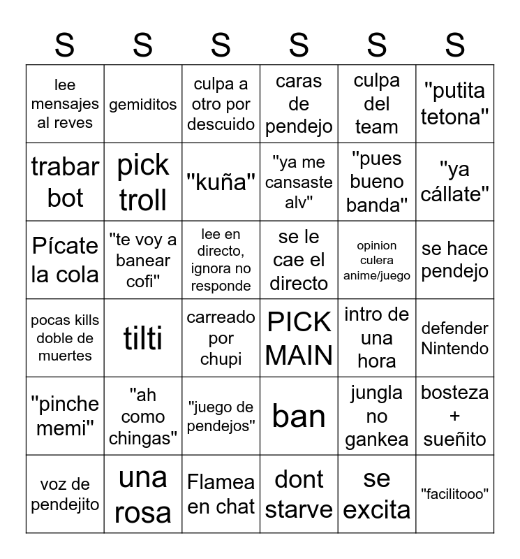 This bingo card has 36 words: ban, ''juego de pendejos'', dont starve, trabar bot, pocas kills doble de muertes, se le cae el directo, pick troll, Flamea en chat, culpa del team, jungla no gankea, ''ya cállate'', caras de pendejo, bosteza + sueñito, ''te voy a banear cofi'', ''ya me cansaste alv'', lee mensajes al reves, ''pinche memi'', opinion culera anime/juego, Pícate la cola, culpa a otro por descuido, lee en directo, ignora no responde, tilti, PICK MAIN, carreado por chupi, intro de una hora, gemiditos, ''pues bueno banda'', una rosa, ''kuña'', ''putita tetona'', ''facilitooo'', voz de pendejito, defender Nintendo, se hace pendejo, ''ah como chingas'' and se excita.