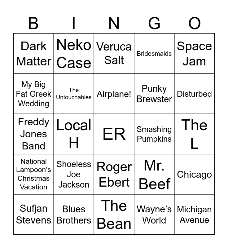 This bingo card has 60 words: Ferris Bueller’s Day Off, Blues Brothers, Home Alone, National Lampoon’s Christmas Vacation, Wayne’s World, A League of Their Own, The Untouchables, Shameless (US), Punky Brewster, Married with Children, Bridesmaids, Meet the Parents, My Big Fat Greek Wedding, Risky Business, Uncle Buck, Dark Matter, ER, Space Jam, The Bikeriders, Airplane!, Smashing Pumpkins, Veruca Salt, Sufjan Stevens, Chicago, Survivor, OK Go, Wilco, Urge Overkill, Disturbed, Plain White T’s, Fall Out Boy, Cheap Trick, Earth, Wind, and Fire, Moby, Neko Case, Led Zeppelin, The Fratellis, Local H, Styx, Freddy Jones Band, Renee Zellweger, Shoeless Joe Jackson, The L, The Wiener’s Circle, Mr. Beef, 36, Willis Tower, Brownies, University of Chicago, Roger Ebert, The Bean, Sausage, Second City, Ace, McDonald’s, Shermer, Chicago Tribune, Malört, Michigan Avenue and Lollapalooza.