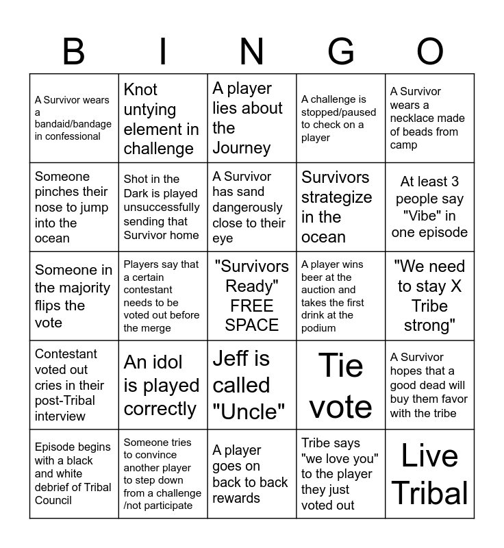 This bingo card has a free space and 24 words: An idol is played correctly, Someone tries to convince another player to step down from a challenge /not participate, A Survivor has sand dangerously close to their eye, Episode begins with a black and white debrief of Tribal Council, A Survivor wears a necklace made of beads from camp, A Survivor wears a bandaid/bandage in confessional, Someone pinches their nose to jump into the ocean, Knot untying element in challenge, A player wins beer at the auction and takes the first drink at the podium, Jeff is called "Uncle", Survivors strategize in the ocean, Someone in the majority flips the vote, Tie vote, A Survivor hopes that a good dead will buy them favor with the tribe, Shot in the Dark is played unsuccessfully sending that Survivor home, Tribe says "we love you" to the player they just voted out, "We need to stay X Tribe strong", A player lies about the Journey, At least 3 people say "Vibe" in one episode, Players say that a certain contestant needs to be voted out before the merge, Live Tribal, Contestant voted out cries in their post-Tribal interview, A challenge is stopped/paused to check on a player and A player goes on back to back rewards.