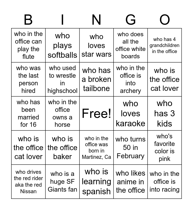 This bingo card has a free space and 24 words: who drives the red rider aka the red Nissan, who is the office baker, who has a broken tailbone, who likes anime in the office, who has 4 grandchildren in the office, who in the office can play the flute, who plays softballs, who loves star wars, who loves karaoke, who has 3 kids, who has been married for 16, who used to wrestle in highschool, who turns 50 in February, who's favorite color is pink, who was the last person hired, who is a huge SF Giants fan, who is learning spanish, who does all the office white boards, who is the office cat lover, who is the office cat lover, who in the office owns a horse, who in the office was born in Martinez, Ca, who in the office is into archery and who in the office is into racing.
