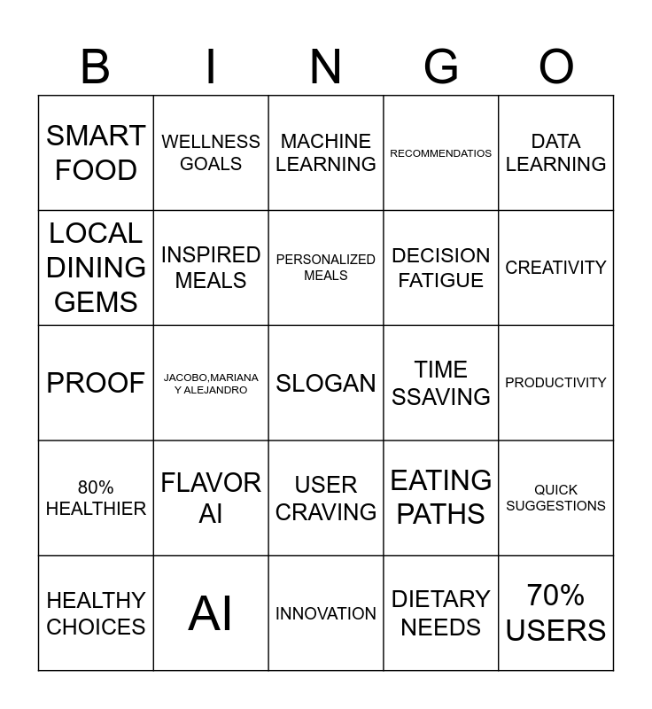 This bingo card has a free space and 24 words: FLAVOR AI, AI, PERSONALIZED MEALS, HEALTHY CHOICES, DATA LEARNING, SMART FOOD, LOCAL DINING GEMS, WELLNESS GOALS, TIME SSAVING, USER CRAVING, DECISION FATIGUE, PROOF, EATING PATHS, QUICK SUGGESTIONS, INSPIRED MEALS, DIETARY NEEDS, PRODUCTIVITY, MACHINE LEARNING, CREATIVITY, JACOBO,MARIANA Y ALEJANDRO, 70% USERS, 80% HEALTHIER, RECOMMENDATIOS and INNOVATION.