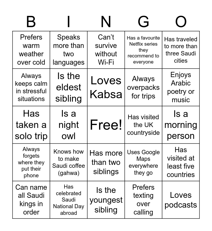 This bingo card has a free space and 24 words: Knows how to make Saudi coffee (gahwa), Has celebrated Saudi National Day abroad, Loves Kabsa, Can name all Saudi kings in order, Has traveled to more than three Saudi cities, Prefers warm weather over cold, Always keeps calm in stressful situations, Speaks more than two languages, Has visited the UK countryside, Has more than two siblings, Always overpacks for trips, Has taken a solo trip, Uses Google Maps everywhere they go, Has visited at least five countries, Is the eldest sibling, Prefers texting over calling, Is a morning person, Can’t survive without Wi-Fi, Enjoys Arabic poetry or music, Is a night owl, Loves podcasts, Always forgets where they put their phone, Has a favourite Netflix series they recommend to everyone and Is the youngest sibling.