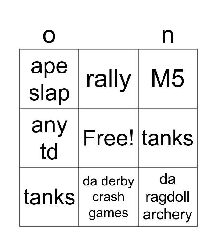 This bingo card has a free space and 10 words: da derby crash games, M5, ape slap, da ragdoll archery, any td, tanks, rally, marbles, tanks and ragdoll archery.