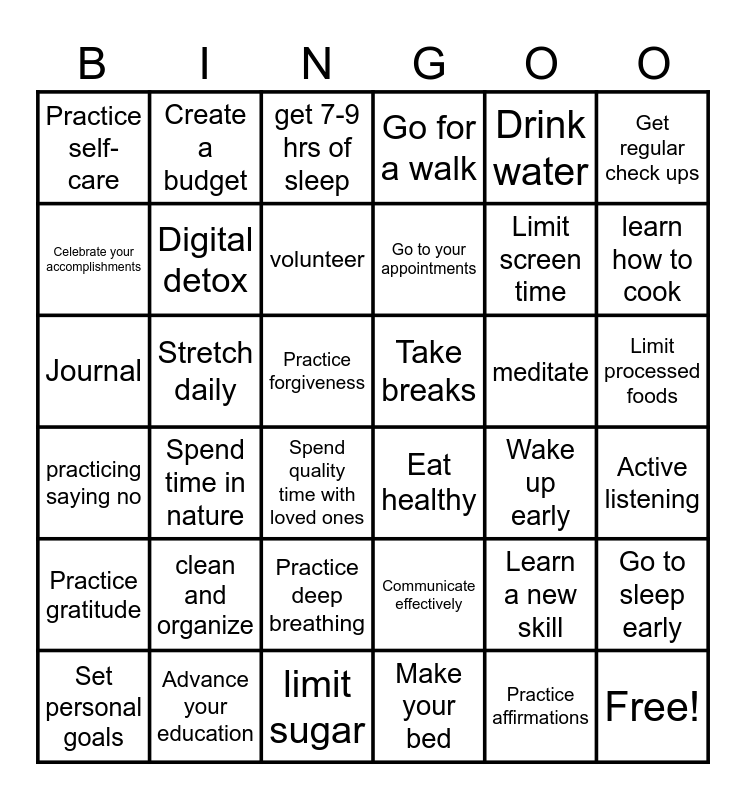 This bingo card has 43 words: Free!, Journal, Do a hobby, Spend quality time with loved ones, Communicate effectively, Active listening, get 7-9 hrs of sleep, Exercise for at least 30 minutes, Drink water, Eat healthy, Go for a walk, Stretch daily, Limit processed foods, meditate, limit sugar, Wake up early, Go to sleep early, Limit screen time, Set boundaries, Go to your appointments, Create a budget, Set personal goals, Learn a new skill, Practice self-care, Complete hygiene, Practice forgiveness, clean and organize, do art, practicing saying no, Take breaks, Treat yourself, Spend time in nature, Advance your education, learn how to cook, Practice deep breathing, Make your bed, Practice gratitude, Digital detox, Get regular check ups, volunteer, Practice affirmations, Celebrate your accomplishments and Surround yourself with positive people.