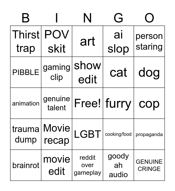 This bingo card has a free space and 24 words: Movie recap, movie edit, show edit, brainrot, person staring, Thirst trap, PIBBLE, POV skit, furry, LGBT, cat, animation, cooking/food, propaganda, gaming clip, goody ah audio, cop, art, dog, genuine talent, GENUINE CRINGE, trauma dump, ai slop and reddit over gameplay.