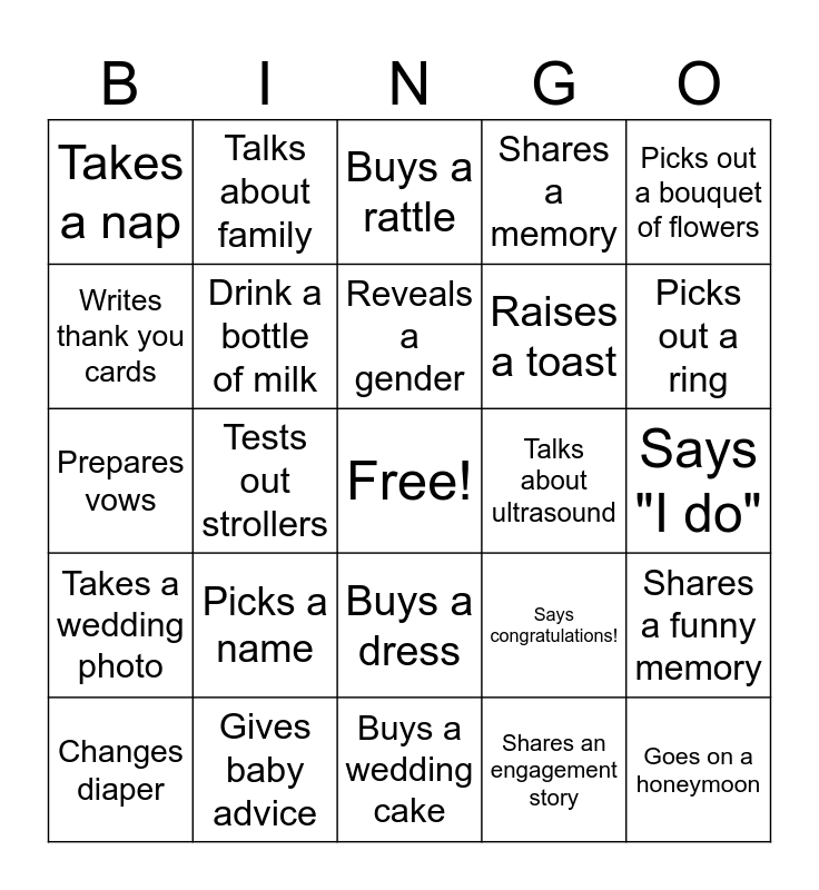 This bingo card has a free space and 29 words: Changes diaper, Buys baby clothes, Tests out strollers, Takes a first step, Takes a nap, Buys a rattle, Drink a bottle of milk, Picks a name, Talks about ultrasound, Gives baby advice, Says "I do", Goes on a honeymoon, Buys a wedding cake, Shares an engagement story, Picks out a ring, Plans a wedding party, Buys a dress, Takes a wedding photo, Picks out a bouquet of flowers, Prepares vows, Says congratulations!, Wraps a gift, Raises a toast, Writes thank you cards, Shares a memory, Talks about family, Shares a funny memory, Reveals a gender and Swaddles a baby.