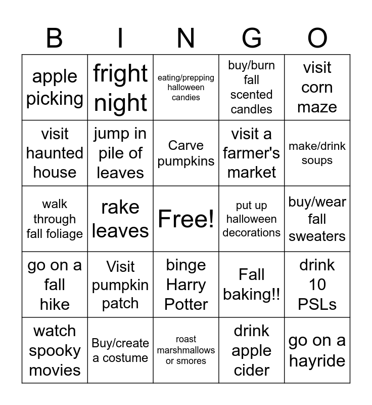 This bingo card has a free space and 24 words: Visit pumpkin patch, Buy/create a costume, Carve pumpkins, watch spooky movies, visit corn maze, apple picking, visit haunted house, fright night, put up halloween decorations, binge Harry Potter, visit a farmer's market, walk through fall foliage, Fall baking!!, drink 10 PSLs, jump in pile of leaves, drink apple cider, buy/wear fall sweaters, eating/prepping halloween candies, make/drink soups, rake leaves, go on a hayride, go on a fall hike, buy/burn fall scented candles and roast marshmallows or smores.