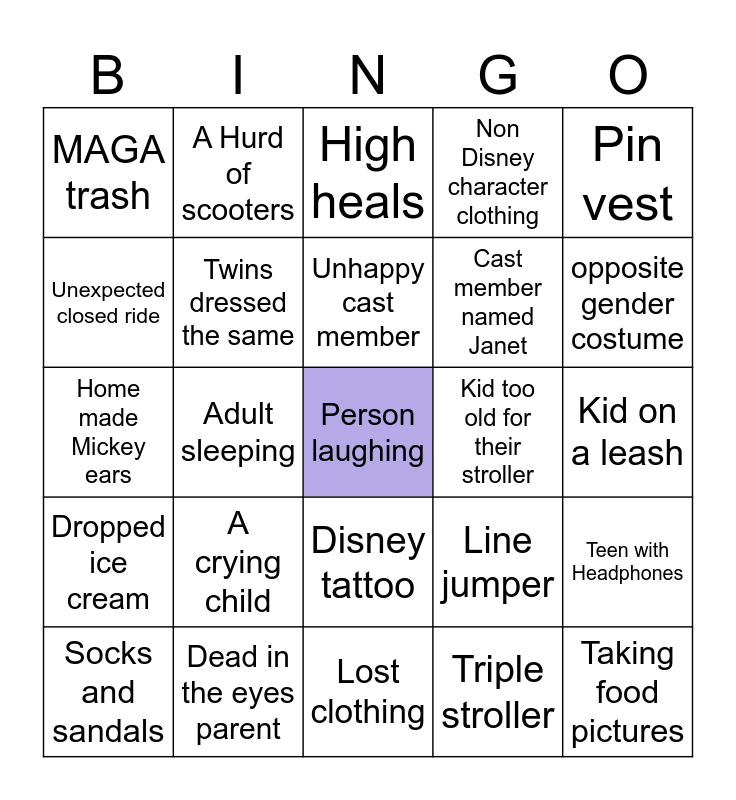 This bingo card has a free space and 24 words: A crying child, Dead in the eyes parent, Unhappy cast member, Socks and sandals, Pin vest, MAGA trash, Unexpected closed ride, A Hurd of scooters, Kid too old for their stroller, Disney tattoo, Cast member named Janet, Home made Mickey ears, Line jumper, Teen with Headphones, Twins dressed the same, Triple stroller, Kid on a leash, High heals, opposite gender costume, Adult sleeping, Taking food pictures, Dropped ice cream, Non Disney character clothing and Lost clothing.