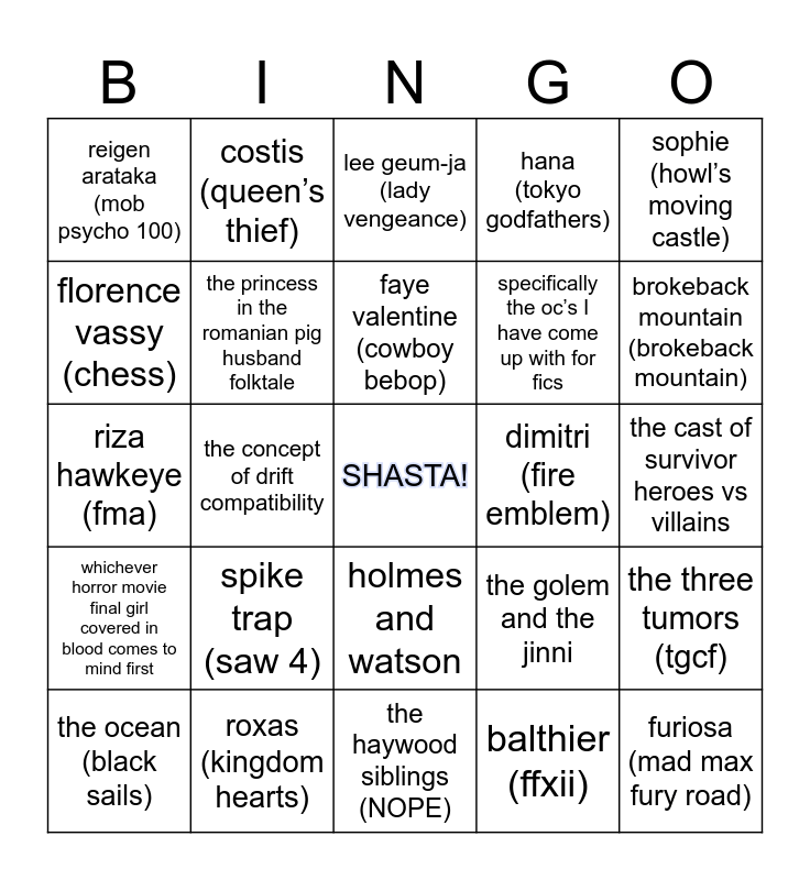 This bingo card has a free space and 24 words: spike trap (saw 4), roxas (kingdom hearts), faye valentine (cowboy bebop), the ocean (black sails), sophie (howl’s moving castle), reigen arataka (mob psycho 100), florence vassy (chess), costis (queen’s thief), dimitri (fire emblem), holmes and watson, specifically the oc’s I have come up with for fics, riza hawkeye (fma), the golem and the jinni, the three tumors (tgcf), the princess in the romanian pig husband folktale, balthier (ffxii), the cast of survivor heroes vs villains, lee geum-ja (lady vengeance), brokeback mountain (brokeback mountain), the concept of drift compatibility, furiosa (mad max fury road), whichever horror movie final girl covered in blood comes to mind first, hana (tokyo godfathers) and the haywood siblings (NOPE).