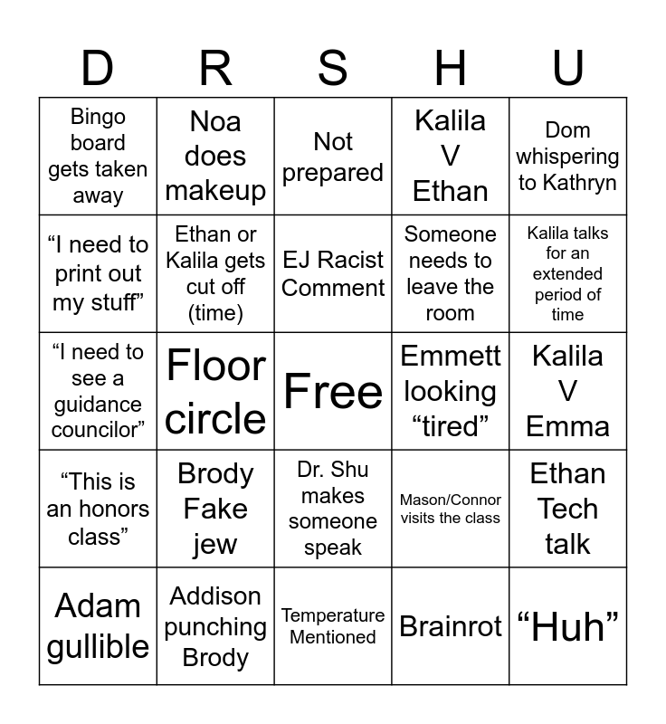 This bingo card has a free space and 34 words: Dr. Shu steps in, Brainrot, Disappearing to bathroom Over 3, Ethan: “Well actually” 🤓☝️, “This is an honors class”, Ethan or Kalila gets cut off (time), Dom whispering to Kathryn, Adam gullible, Noa does makeup, “I didn’t answer this question”, EJ Racist Comment, Not prepared, Adam Shirt, “Wait there is a Socratic seminar today?”, Emmett looking “tired”, Kalila talks for an extended period of time, Addison punching Brody, “I need to see a guidance councilor”, Brody Fake jew, Mason/Connor visits the class, Dr. Shu makes someone speak, Kathryn and Ollie giggling, Bingo board gets taken away, Kalila V Emma, Temperature Mentioned, “Huh”, Kalila V Ethan, Emmett speaks, Someone needs to leave the room, “I need to print out my stuff”, Made it to the Socratic seminar room, Floor circle, Ethan Tech talk and Riv mentioned.