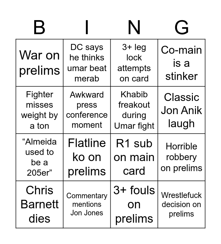 This bingo card has 16 words: Commentary mentions Jon Jones, Horrible robbery on prelims, 3+ leg lock attempts on card, War on prelims, “Almeida used to be a 205er”, DC says he thinks umar beat merab, R1 sub on main card, 3+ fouls on prelims, Fighter misses weight by a ton, Awkward press conference moment, Chris Barnett dies, Co-main is a stinker, Flatline ko on prelims, Classic Jon Anik laugh, Khabib freakout during Umar fight and Wrestlefuck decision on prelims.