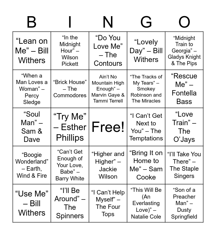 This bingo card has a free space and 75 words: “I Got You (I Feel Good)” – James Brown, “Respect” – Aretha Franklin, Ain’t No Mountain High Enough” – Marvin Gaye & Tammi Terrell, “What’s Going On” – Marvin Gaye, “Try a Little Tenderness” – Otis Redding, “Stand by Me” – Ben E. King, “My Girl” – The Temptations, “(Sittin’ on) the Dock of the Bay” – Otis Redding, “Let’s Stay Together” – Al Green, “Papa’s Got a Brand New Bag” – James Brown, “Chain of Fools” – Aretha Franklin, “I Heard It Through the Grapevine” – Gladys Knight & The Pips, “Higher and Higher” – Jackie Wilson, “The Tracks of My Tears” – Smokey Robinson and The Miracles, “Superstition” – Stevie Wonder, “When a Man Loves a Woman” – Percy Sledge, “I’ll Be Around” – The Spinners, “A Change Is Gonna Come” – Sam Cooke, “If You Don’t Know Me by Now” – Harold Melvin & The Blue Notes (ft. Teddy Pendergrass), “Rescue Me” – Fontella Bass, “Heatwave” – Martha and The Vandellas, “In the Midnight Hour” – Wilson Pickett, “I Can’t Help Myself” – The Four Tops, “Lovely Day” – Bill Withers, “Midnight Train to Georgia” – Gladys Knight & The Pips, “Try Me” – James Brown, “I Second That Emotion” – Smokey Robinson and The Miracles, “Got to Give It Up” – Marvin Gaye, “What’d I Say” – Ray Charles, “I Want You Back” – The Jackson 5, “The Tears of a Clown” – Smokey Robinson and The Miracles, “For Once in My Life” – Stevie Wonder, “Everybody Needs Somebody to Love” – Solomon Burke, “Bring It on Home to Me” – Sam Cooke, “Love Train” – The O’Jays, “Lean on Me” – Bill Withers, “Signed, Sealed, Delivered (I’m Yours)” – Stevie Wonder, “Baby Love” – The Supremes, “I Can’t Get Next to You” – The Temptations, “Son of a Preacher Man” – Dusty Springfield, “Dancing in the Street” – Martha and The Vandellas, “Let’s Get It On” – Marvin Gaye, “I Never Loved a Man (The Way I Love You)” – Aretha Franklin, “Oh Girl” – The Chi-Lites, “The Love You Save” – The Jackson 5, “Knock on Wood” – Eddie Floyd, “Try Me” – Esther Phillips, “Do You Love Me” – The Contours, “You Are the Best Thing” – Ray LaMontagne, “That’s the Way of the World” – Earth, Wind & Fire, “Rock Steady” – Aretha Franklin, “Brick House” – The Commodores, “If I Were Your Woman” – Gladys Knight & The Pips, “Let’s Groove” – Earth, Wind & Fire, “Lady Marmalade” – Labelle, “What You Won’t Do for Love” – Bobby Caldwell, “Just the Two of Us” – Bill Withers, “Boogie Nights” – Heatwave, “Never Too Much” – Luther Vandross, “I Can’t Stand the Rain” – Ann Peebles, “Use Me” – Bill Withers, “Give Me the Night” – George Benson, “Do Right Woman, Do Right Man” – Etta James, “When Something Is Wrong with My Baby” – Sam & Dave, “That Lady” – The Isley Brothers, “Soul Man” – Sam & Dave, “Love and Happiness” – Al Green, “Sweet Thing” – Rufus featuring Chaka Khan, “September” – Earth, Wind & Fire, “I’ll Take You There” – The Staple Singers, “Boogie Wonderland” – Earth, Wind & Fire, “Can’t Get Enough of Your Love, Babe” – Barry White, “I Wish” – Stevie Wonder, “This Will Be (An Everlasting Love)” – Natalie Cole and How Sweet It Is (To Be Loved By You) – Marvin Gaye.