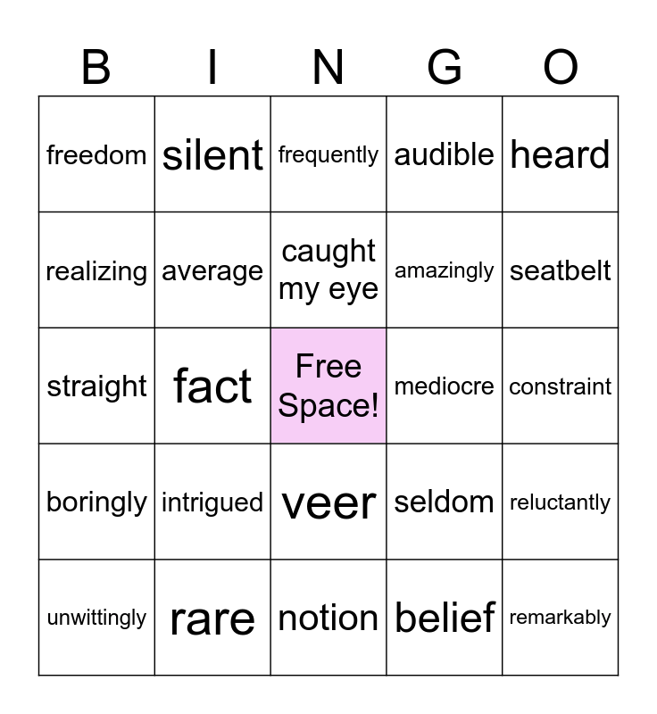 This bingo card has a free space and 24 words: intrigued, rare, caught my eye, unwittingly, heard, freedom, realizing, silent, mediocre, veer, amazingly, straight, seldom, reluctantly, average, belief, constraint, frequently, seatbelt, fact, remarkably, boringly, audible and notion.