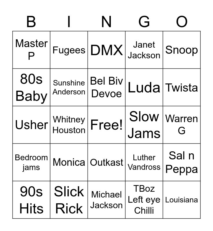 This bingo card has a free space and 24 words: Monica, Slick Rick, Bel Biv Devoe, 90s Hits, Snoop, Master P, 80s Baby, Fugees, Slow Jams, Outkast, Luda, Usher, Luther Vandross, Sal n Peppa, Sunshine Anderson, TBoz Left eye Chilli, Warren G, DMX, Twista, Whitney Houston, Louisiana, Bedroom jams, Janet Jackson and Michael Jackson.