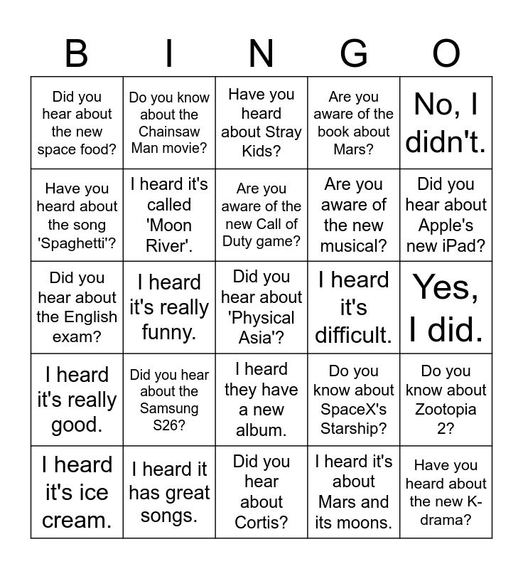 This bingo card has 25 words: Did you hear about the Samsung S26?, Did you hear about Cortis?, Are you aware of the new Call of Duty game?, I heard it's ice cream., No, I didn't., Did you hear about the new space food?, Have you heard about the song 'Spaghetti'?, Do you know about the Chainsaw Man movie?, I heard it's difficult., I heard they have a new album., Are you aware of the new musical?, Did you hear about the English exam?, Do you know about SpaceX's Starship?, Do you know about Zootopia 2?, I heard it's called 'Moon River'., Have you heard about the new K-drama?, Yes, I did., Have you heard about Stray Kids?, Did you hear about Apple's new iPad?, I heard it's really funny., Did you hear about 'Physical Asia'?, I heard it has great songs., I heard it's really good., Are you aware of the book about Mars? and I heard it's about Mars and its moons..