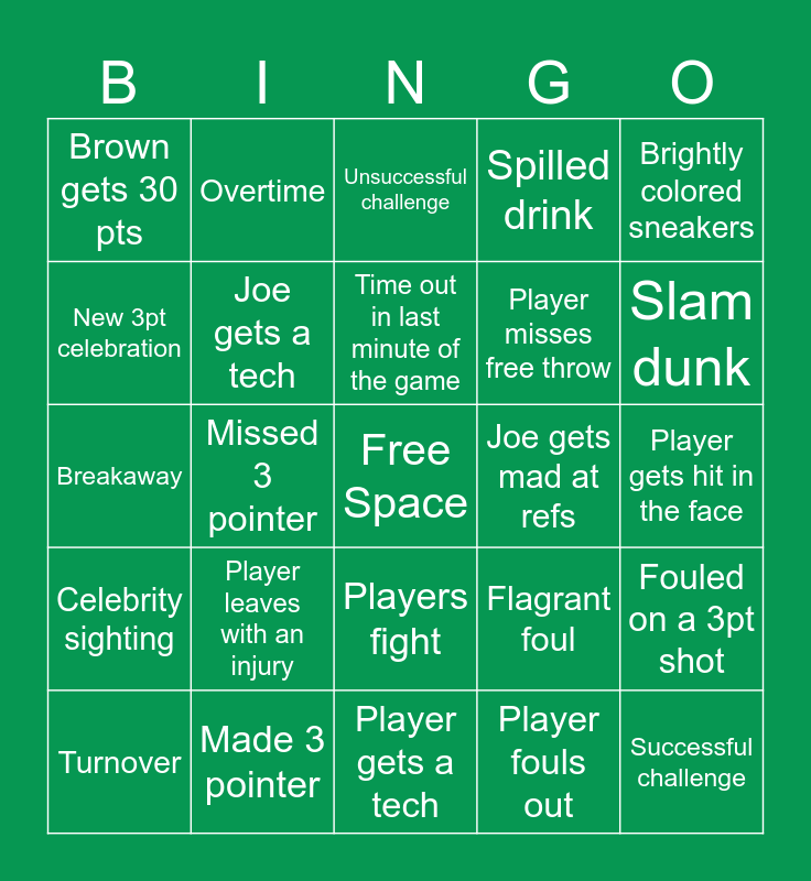 This bingo card has a free space and 24 words: Player leaves with an injury, Made 3 pointer, Time out in last minute of the game, Turnover, Brightly colored sneakers, Brown gets 30 pts, New 3pt celebration, Overtime, Joe gets mad at refs, Players fight, Player misses free throw, Breakaway, Flagrant foul, Fouled on a 3pt shot, Joe gets a tech, Player fouls out, Player gets hit in the face, Unsuccessful challenge, Slam dunk, Missed 3 pointer, Successful challenge, Celebrity sighting, Spilled drink and Player gets a tech.