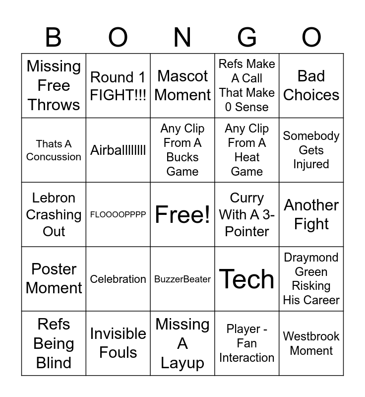 This bingo card has a free space and 24 words: Refs Being Blind, Celebration, Any Clip From A Bucks Game, Player -Fan Interaction, Bad Choices, Missing Free Throws, Round 1 FIGHT!!!, Mascot Moment, Curry With A 3-Pointer, Another Fight, Lebron Crashing Out, Airballllllll, Tech, Draymond Green Risking His Career, Thats A Concussion, Invisible Fouls, Missing A Layup, Refs Make A Call That Make 0 Sense, Somebody Gets Injured, Poster Moment, FLOOOOPPPP, BuzzerBeater, Any Clip From A Heat Game and Westbrook Moment.