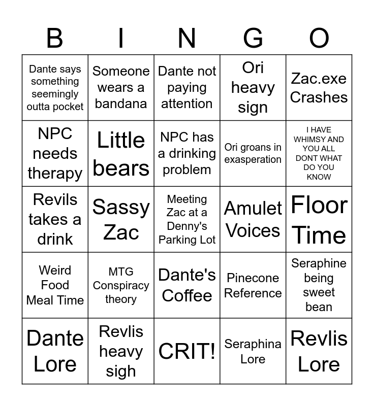 This bingo card has a free space and 45 words: A wild Ras Appears, Revlis Lore, Ori Lore, Dante Lore, Espen Lore, Seraphina Lore, Dante not paying attention, Espen Bear Reference, Zac.exe Crashes, Revlis heavy sigh, Ori heavy sign, Amulet Voices, Dante's Coffee, MTG Conspiracy theory, Party Mom/Dad Reference, CRIT!, Dante lizard blink, Revils takes a drink, Fae Shenanigans, I HAVE WHIMSY AND YOU ALL DONT WHAT DO YOU KNOW, Someone wears a bandana, World Lore Drop, Boat Reference, Dante says something seemingly outta pocket, Ori's F**k Off Weapons, Floor Time, Zac says something savage, Puppy Cam!, Pinecone Reference, Weird Food Meal Time, Dante Wants a Cookie, Seraphine being sweet bean, "Take Inspiration", Old Man Yells At Sky, Someone gives Dante instructions for some reason, Sassy Zac, Dante zones out, Espen brings up stars, Seraphina says something vaguely unsettling, NPC has a drinking problem, NPC needs therapy, Ori groans in exasperation, Ori groans in exasperation, Little bears and Sassy Revlis.